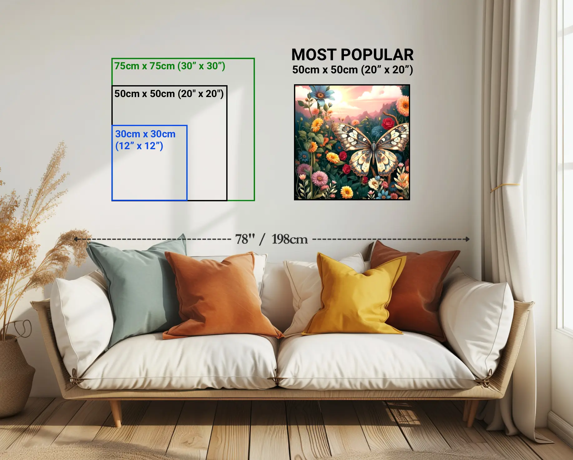 Small 12" × 12" or 30cm × 30cm, Medium 20" × 20" or 50cm × 50cm (Most Popular), Large 30" × 30" or 750cm × 75cm