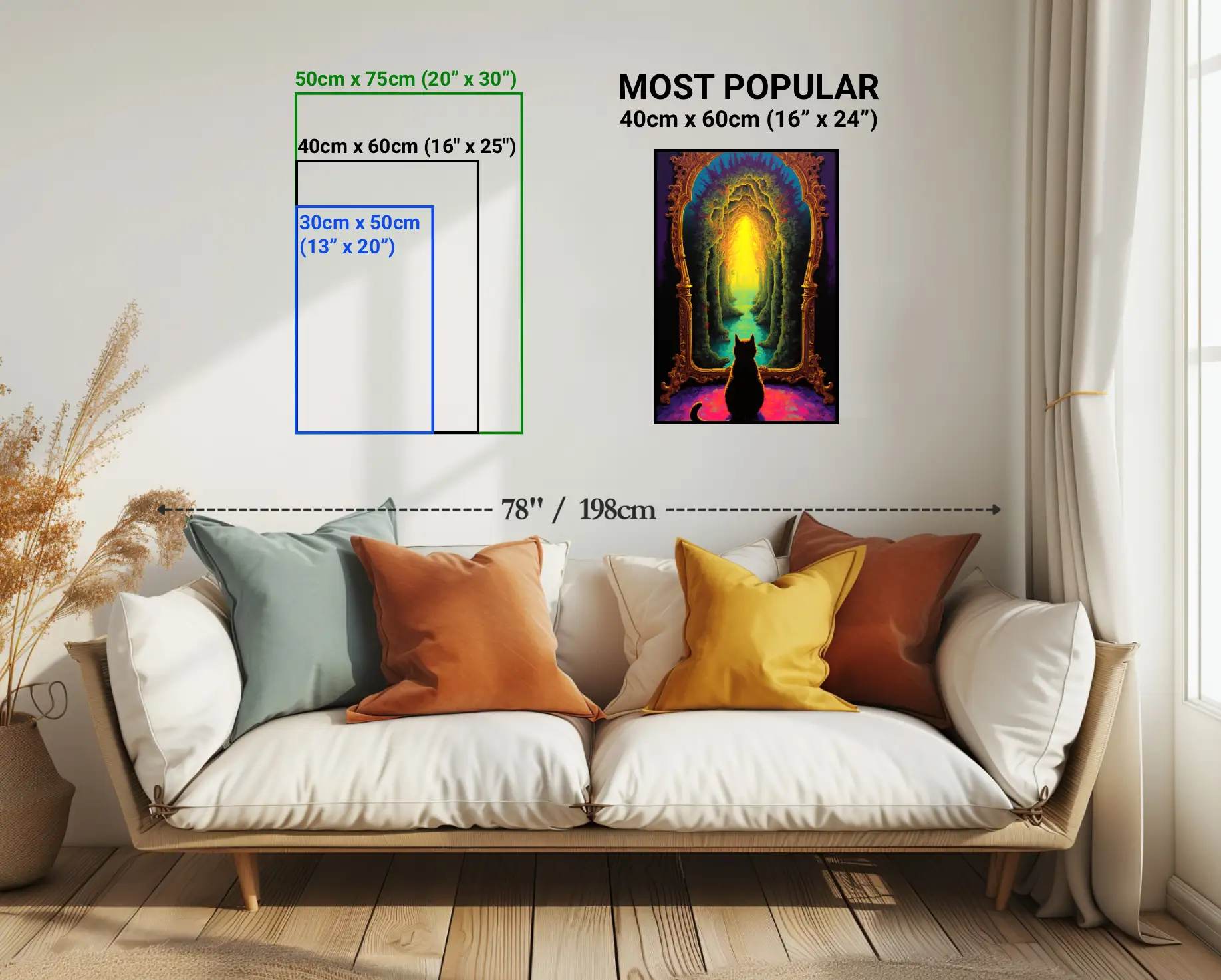Small 13" × 20" or 30cm × 50cm, Medium 16" × 24" or 40cm × 60cm (Most Popular), Large 20" × 30" or 50cm × 75cm