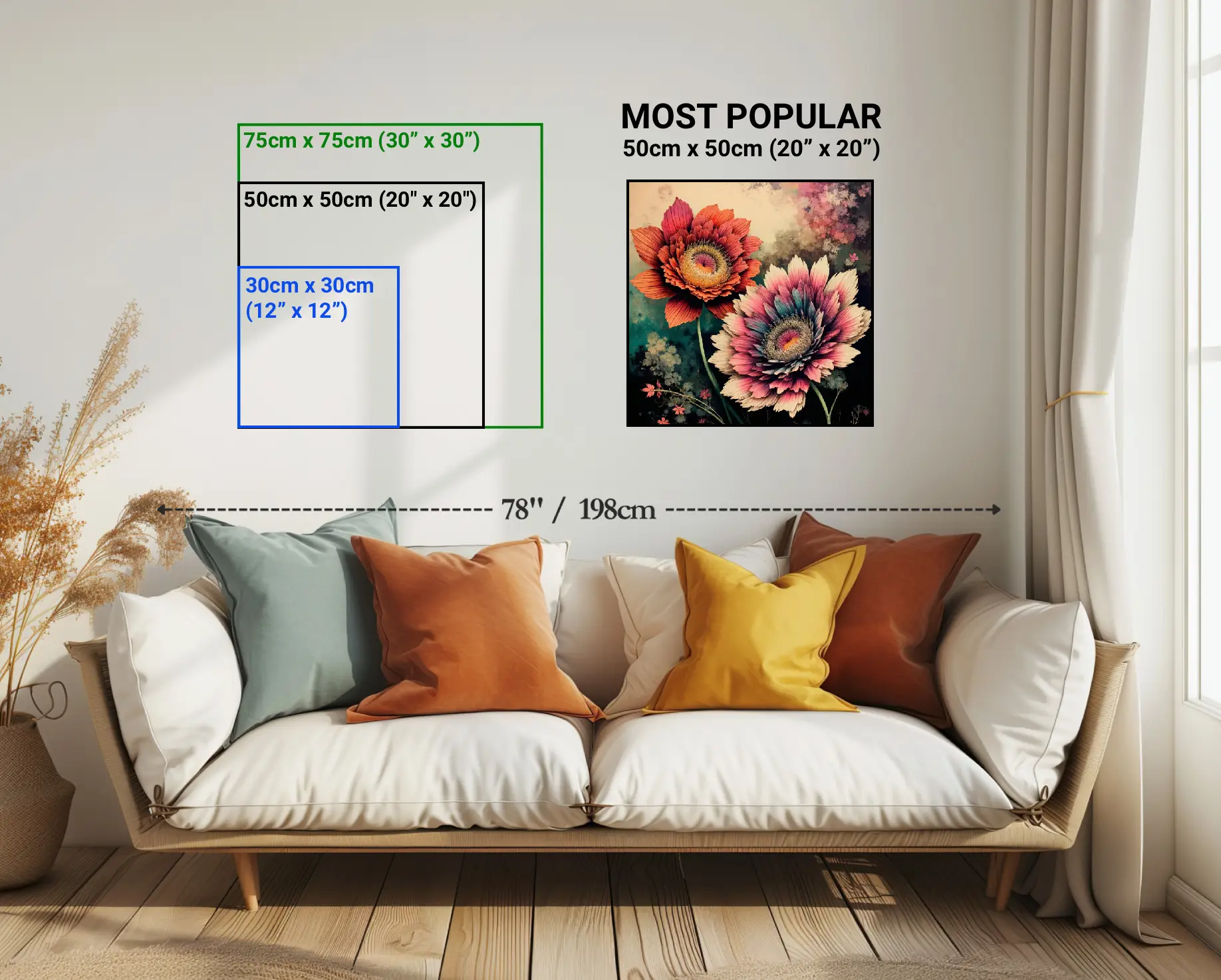 Small 12" × 12" or 30cm × 30cm, Medium 20" × 20" or 50cm × 50cm (Most Popular), Large 30" × 30" or 750cm × 75cm