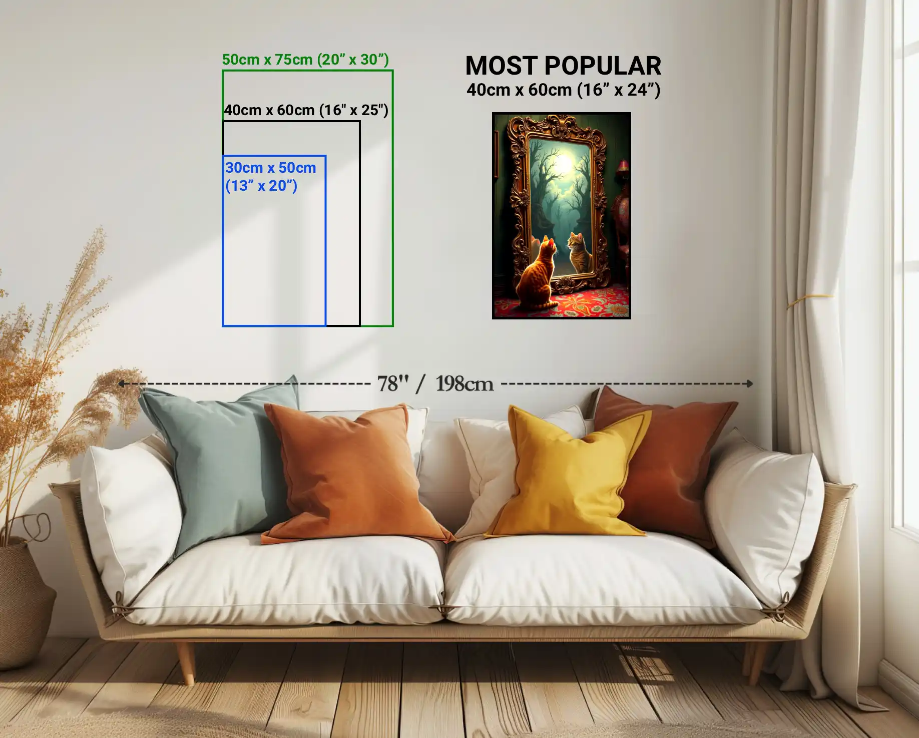 Small 13" × 20" or 30cm × 50cm, Medium 16" × 24" or 40cm × 60cm (Most Popular), Large 20" × 30" or 50cm × 75cm